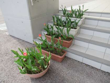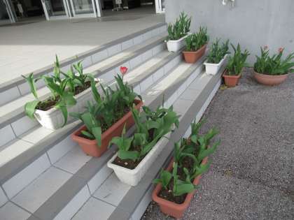 桜の花も散り始めていますが、生徒玄関前のプランターのチューリップは、もうすぐ咲きそうです。