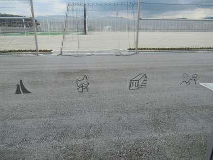 ガラス戸の中央に絵が描かれています。これは、生徒がデザインしたもので、衝突防止用のイラストです。