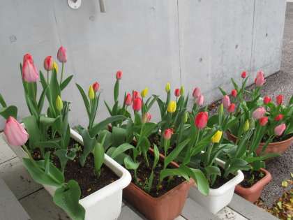 桜の花は完全に散ってしまいましたが、生徒玄関のプランターではチューリップが「今度は私たちの番よ!」と言っているように、咲き誇っています。