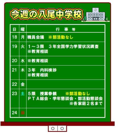 今週も学力調査に教育相談、内科検診、授業参観とたくさんの行事があります。