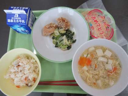 今日は、入学・進級をお祝いするメニューです。デザート付きで嬉しいですね。