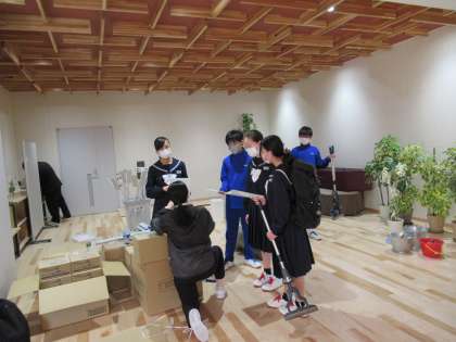 美化委員会の生徒は、清掃用具を各場所に配付しています。