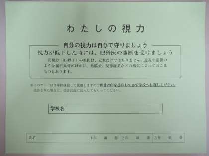 視力がB(0.9以下)であった生徒には、「わたしの視力」カードをお渡しします。