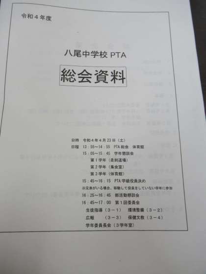 昨日、お子様を通じて、「令和4年度 八尾中学校PTA総会資料」を配付しました。