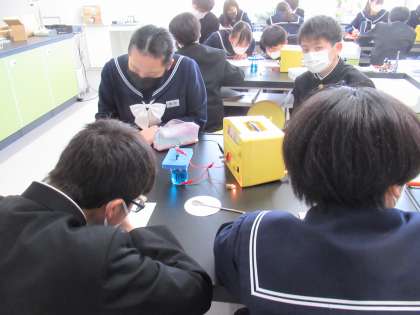 「塩化銅水溶液の電気分解の変化を調べよう」という課題で、実験中です。