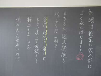 教室の黒板に担任からの温かいメッセージが書いてあります。