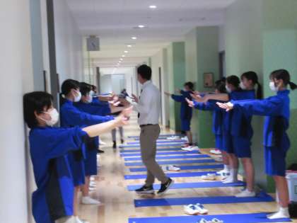 部活動は、廊下や「スポーツのニワ」を活用して行っています。活動場所がたくさんあるので、雨の日も安心!恵まれた環境に感謝!