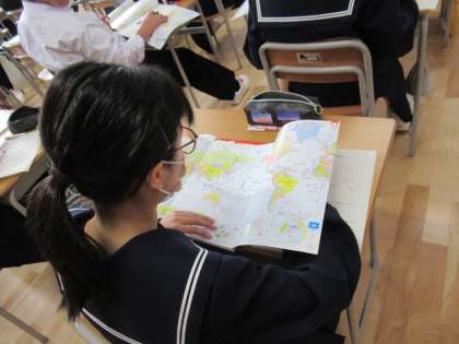 世界の国々の場所や首都を地図帳を使って確認しながら学習を進めています。