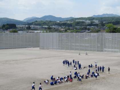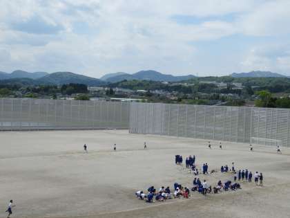 こまめに水分補給をしたり、休憩したりしながら計測しています。広いグラウンドなので、生徒が小さく見えます。