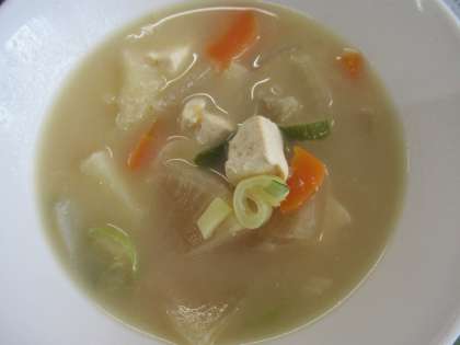 「けんちん汁」には、ゴボウやニンジン、大根、サトイモ等の根菜を中心とした野菜と、コンニャク、ネギ、キノコ類、豆腐等が入っています。豚汁と似ていますが、大きな違いは、「豚肉」という「生きていたもの」が使われていないところです。