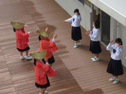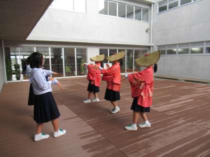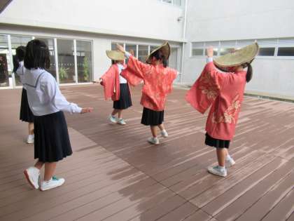 今日は、3年生が久しぶりに笠をかぶり、おわらを踊ってみました。「学びのニワ」が素敵なおわら会場となりました。