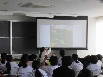 写真上は、理科の授業の様子です。身近な種をもつ野菜等の写真を見ながら、共通点を確認しています。