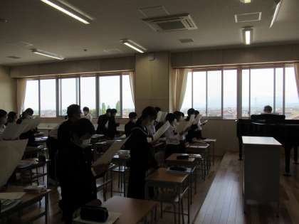 写真下は、音楽の授業の様子です。校歌の練習をしています。素敵な歌詞とメロディは、あっという間に覚えて知らず知らずのうちに口ずさむことができます。