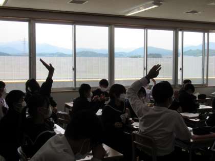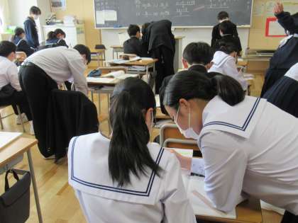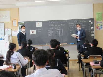 5月10日(火) 2年生 授業の様子 公開日 2022/05/10 更新日 2022/05/10 2学年 写真上中は、英語の授業の様子です。今日はALTのJ先生との授業です。過去進行形を使ってアリバイを聞き出し、犯人を捜すという探偵活動を行いました。 写真下は、数学の授業の様子です。互いに教えて合っています。