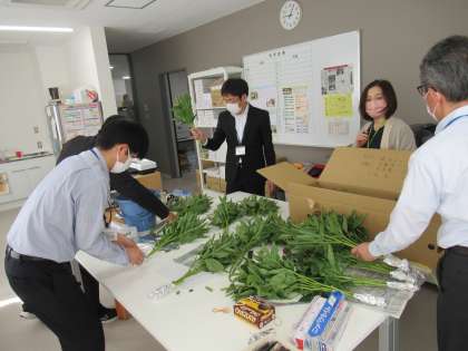 教職員が、手分けして、班ごとに分けたり、咲いてしまわぬよう水を切り口に付けたり準備をしました。