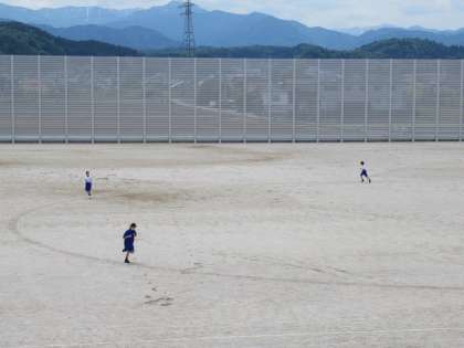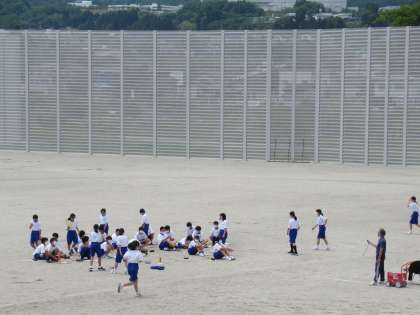 広いグラウンドで持久走をしています。