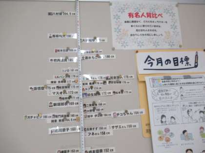 著名人やキャラクターの身長が記してあります。サザエさん、ドラえもん、コナン、チコちゃん、、、等と背比べできますよ。
