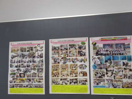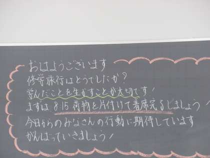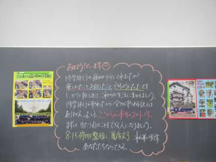 教室の黒板に、担任の先生からのメッセージと修学旅行3日間のダイジェスト版の写真が掲示してある教室があります。