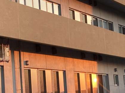 夕日が校舎の窓に映り、とてもきれいです。