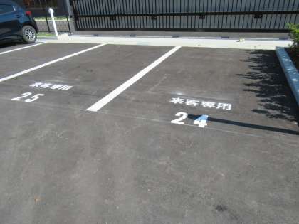 「入口はこちらです」の看板に引き続き、来客用駐車場所の表示をコンクリートにスプレーで付けました。