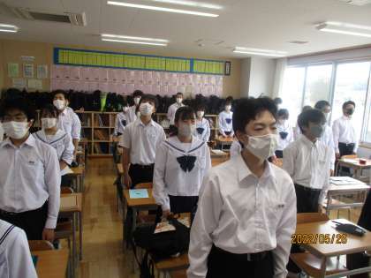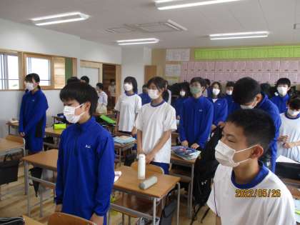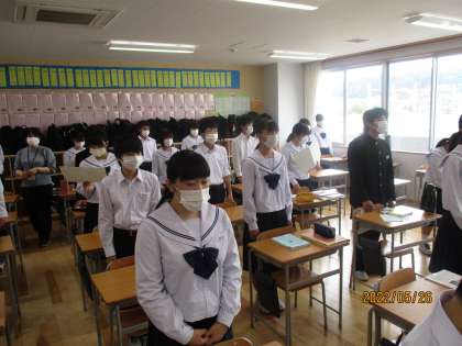 朝の校歌練習の2日目です。昨日と比べて、楽譜を見ながら歌っている生徒がずいぶん少なくなりました。