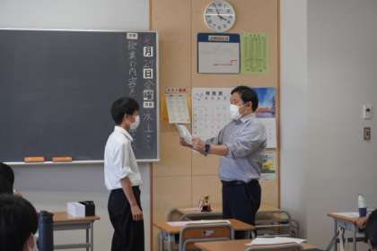体育の体力テストで行ったシャトルランの平均回数が、一番高かったクラスに、1学年主任から賞状とカップが贈られました。