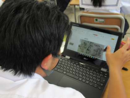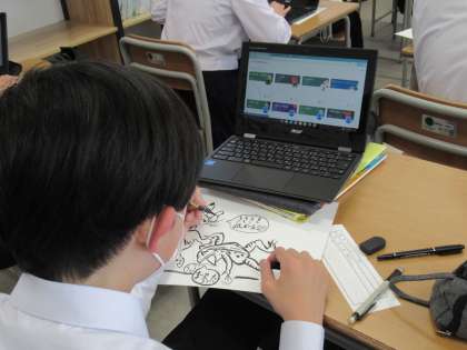 それをchromebookで撮影し、漫画にしています。楽しそうにワクワクしながら取り組んでいます。