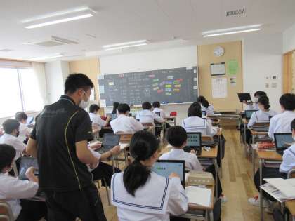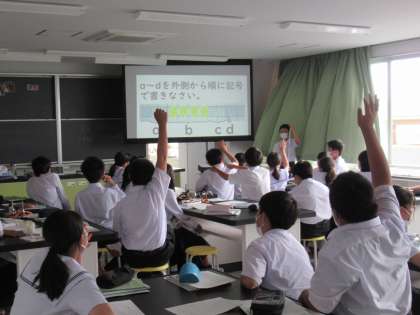 各自家庭学習で調べたことを発表しています。クイズ形式で発表すると、他の生徒が挙手して答えています。自分たちで授業を進めています。