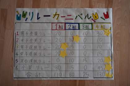 昨日、1年生は、リレーカーニバルを行いました。結果は写真の通りです。