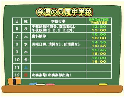今週は月曜と水曜日の下校時間が早いため、スクールバスは14:45の一便しかありません。確認お願いします。