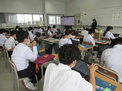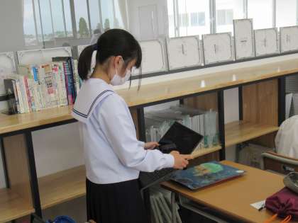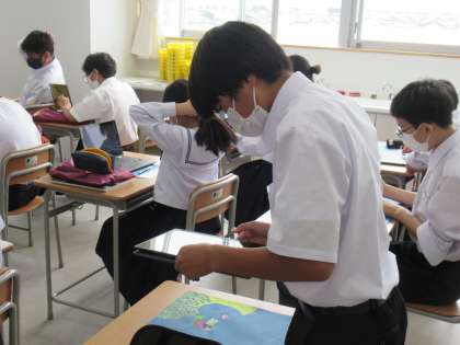 「不思議な山の町」が完成し、chromebookで作品を撮影し、保存して作品集を作成します。