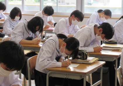社会の授業では、学習内容の定着のために小テストを定期的に行っています。小テスト前は学習内容の確認をしたり、問題を出し合ったりしている場面も見られました。