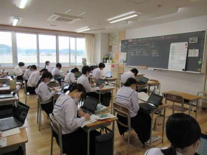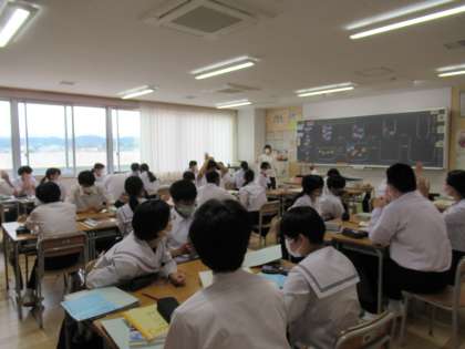 写真上は、社会科の授業の様子です。今日からいよいよ公民の学習がスタートしました。情報化社会について考えています。