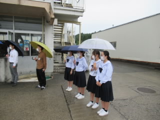 本校からは生徒会執行部の4人が代表として、八尾高校の正門前で挨拶を交わしています。