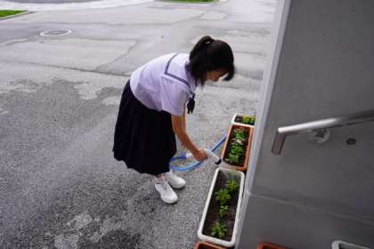 先日から、生徒玄関前のプランターに委員会の生徒が水をあげています。