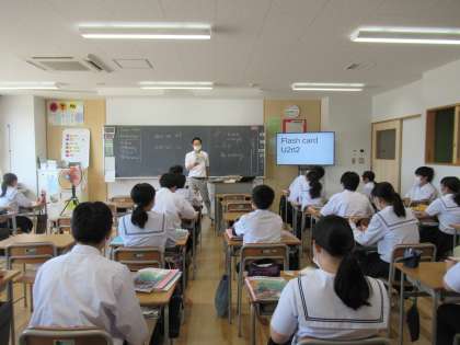 ペアで音読した後、教科書を閉じて先生の後についてリピートしています。