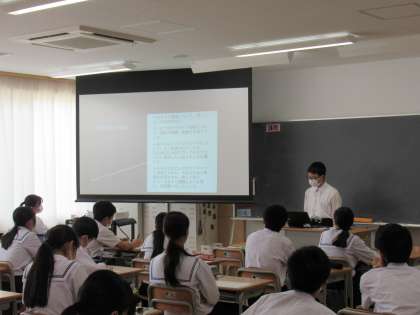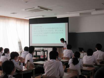 chromebookのスライドを活用して作成したものを示して発表しています。