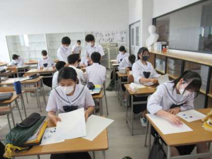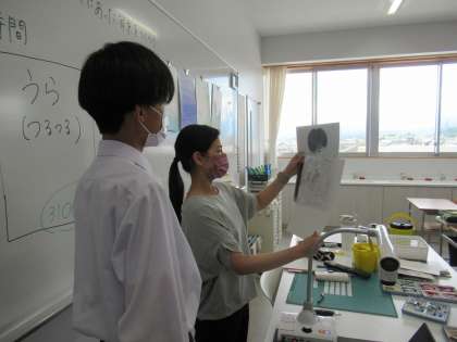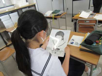 スパッタリング(ブラシで絵の具を振りかける)で、背景を作成している生徒もいれば、指でぼかしながら幻想的な背景を作成している生徒もいます。