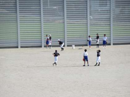 野球部は、明日市民体育大会があります。顧問の先生のノックを受けています。