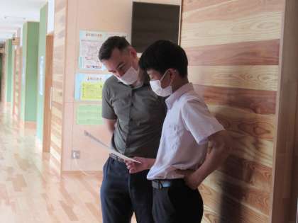今日は、ALTのJ先生に、一人ずつ発音チェックをしてもらっています。