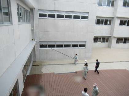 地区の用務員さんの研修会が本校で行われています。窓ふきについての研修のようです。