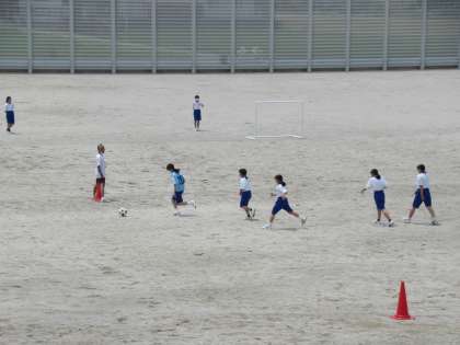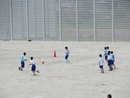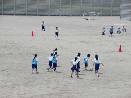 グラウンドで、試合形式でサッカーをしています。 ついついボールに群がってしまいます。