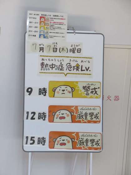 熱中症警戒指数は、12時、15時は厳重注意の予報が出ています。熱中症対策をしっかりと行いましょう。