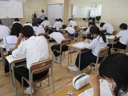 2学期に開催予定の合唱コンクールに向けて、学年合唱とクラス合唱の曲を選ぶために、合唱曲を鑑賞しています。真剣に聴き入っています!