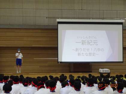 実行委員長の言葉、実行委員からスローガンの発表がありました。第1回体育大会らしく今年のスローガンは、「一新紀元〜創り出せ!八中の新たな歴史〜」です。