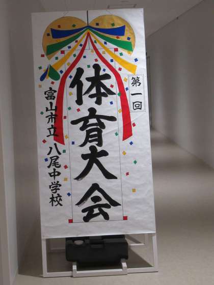 用務員さんが心を込めて作ってくださった「体育大会看板」「プラカード」も結団式で披露しました。素晴らしい看板です。