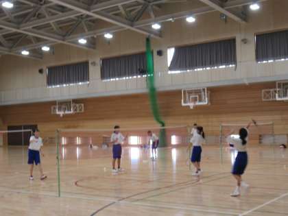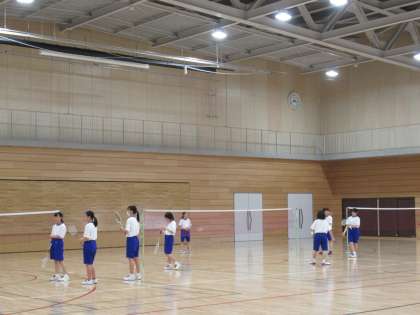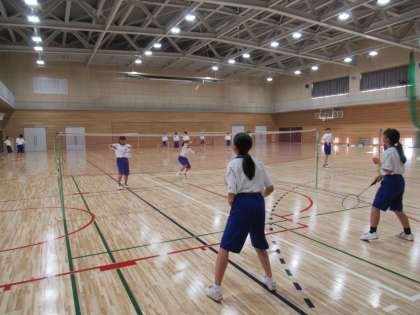 体育館を全部使って試合形式で練習中です。バドミントン部は部員数が多いので、体育館全面使えるのはありがたいですね。