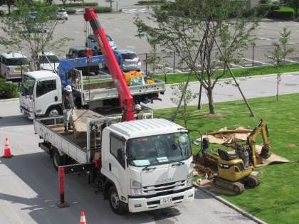 大きなクレーン車でつり上げて、芝生の上に埋め込みます。
