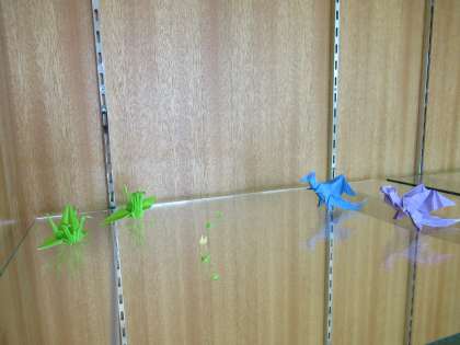 よく見ると、陳列棚にも折り紙の作品が、、、。キングギドラ?恐竜?