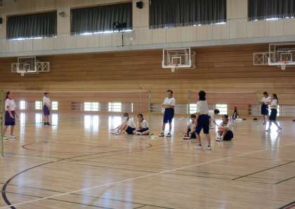 体育館ではバドミントン部が時間で区切りながら練習しています。